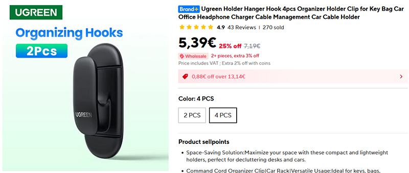 Всегда полезные в хозяйстве самоклеющиеся крючки Ugreen Holder Hanger Hook - для ключей, кабелей, да для чего угодно. В отзывах пишут, что держатся очень хорошо, да и выглядят симпатично, интерьер не портят.