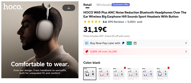 Недорогие наушники-полноформаты с активным шумоподавлением HOCO W65. Bluetooth 5.4, вес 210 г, сменные амбушюры, автономная работа - 45 часов (32 часа с включенным шумодавом). Шесть вариантов цветов. Более 5000 продаж, средняя оценка 4,6.