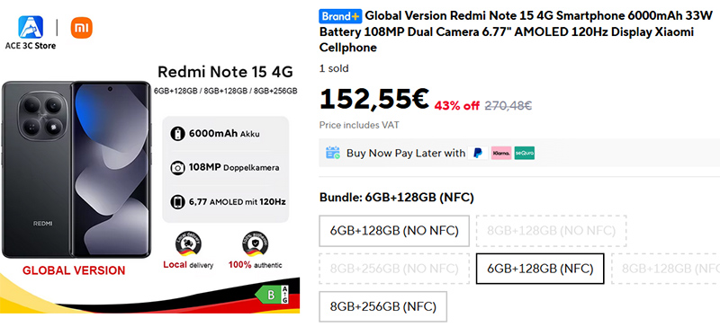 Интересный вариант бюджетного смартфона Xiaomi Redmi Note 15 4G. Я делал обзор Redmi Note 15 5G, который стоит €234, тут модель заметно дешевле, причем все отличия - влагозащита IP64 вместо IP66, процессор Mediatek Helio G100 Ultra, нет хилого сверхширика (основная камера та же самая), видео FullHD без стабилизации, аккумулятор 6000 мАч с мощностью зарядки 33 Вт.
