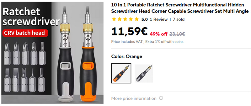 Сын попросил купить ему отвертку с набором бит и обязательно с храповым механизмом (чтобы можно было фиксировать закручивание или откручивание) - ему нужно, чтобы у меня каждый раз не просить отвертки. Мы порылись на Aliexpress и нашли вот такой вариант, у которого кроме всего перечисленного набор бит скрывается прямо в ручке, также головка с битой может фиксироваться в пяти различных положениях, что в некоторых случаях бывает очень полезным.