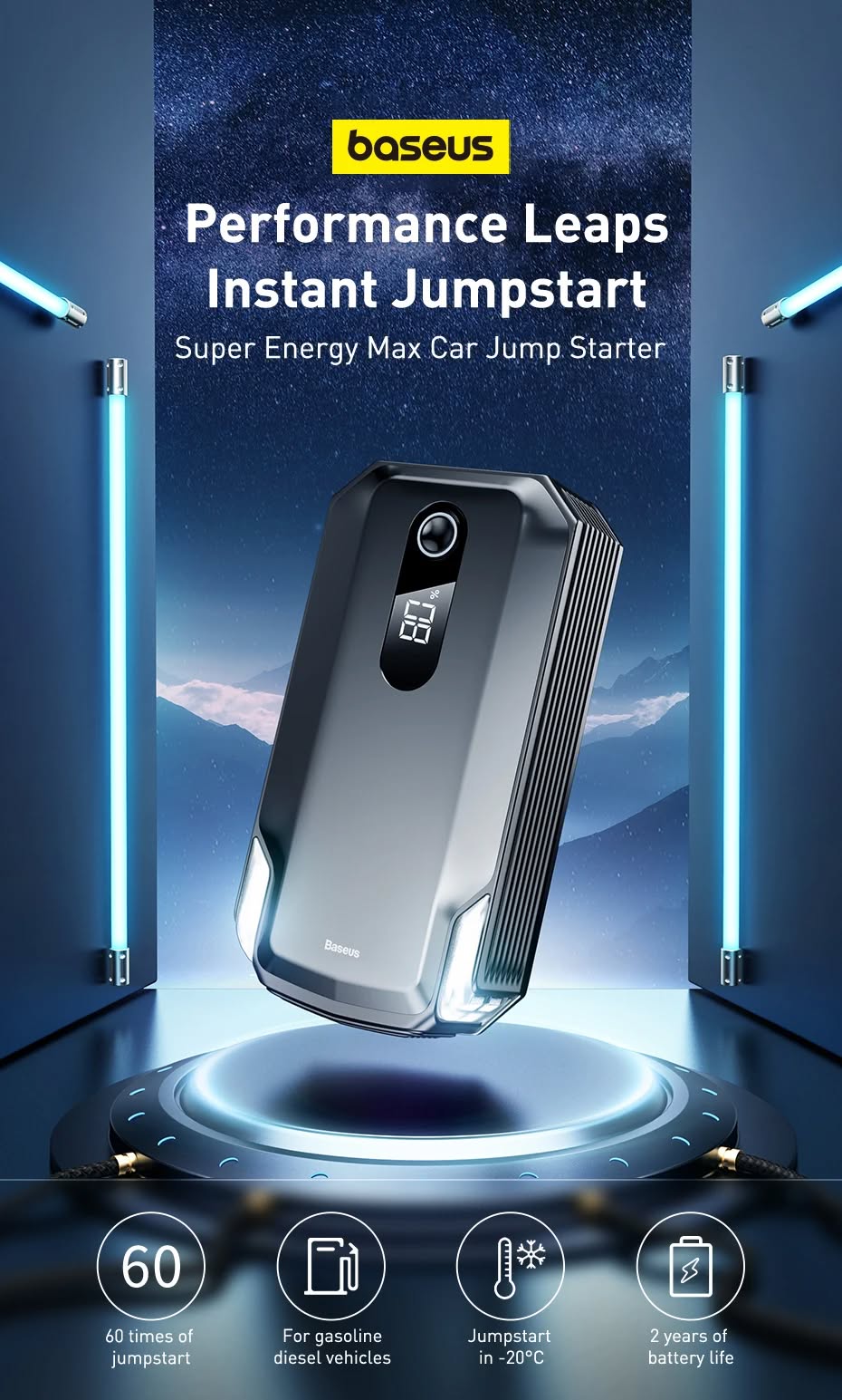 Небольшой, но мощный. Подходит как для бензиновых, так и для дизельных автомобилей. Можно использовать в качестве павербанка, есть два USB-А выхода. Также есть фонарик с 3мя режимами. Работает при температуре до -20. В комплекте кабель для зарядки, крокодилы и инструкция.