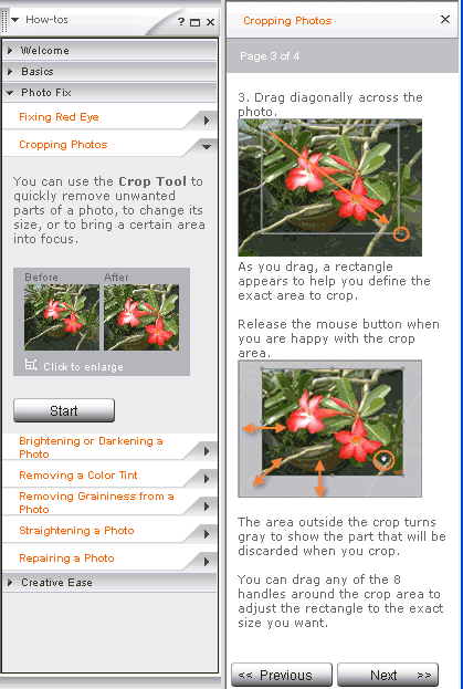 Интерактивный раздел помощи (How-tos) - весьма удобен (особенно для тех, кто может хоть как-то читать по-английски). Там вы можете выбрать любую из интересующих вас операций (тот же Crop, например), и при нажатии на ссылку программа выводит подробное ее описание по шагам.