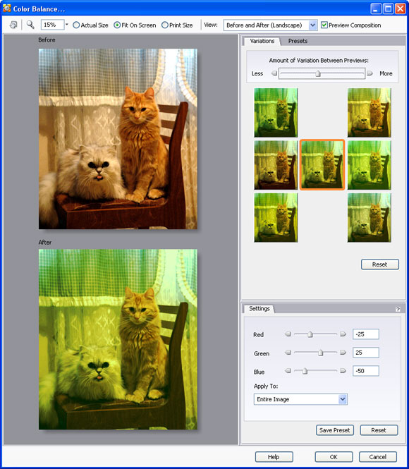 Если нужно более тонко подобрать параметры (например, при настройке цветового баланса), выдается специальное окно с кучей самых разнообразных вариантов.