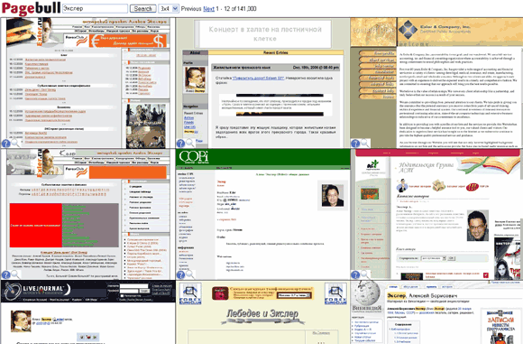 Любопытный поисковичок под названием PageBull, который умеет представлять найденные сайты в виде скриншотов, причем в разных вариантах. По-русски тоже ищет, причем, что удивительно, вполне пристойно и релевантно. Вот, например, результат поиска по простому слову "Экслер":
