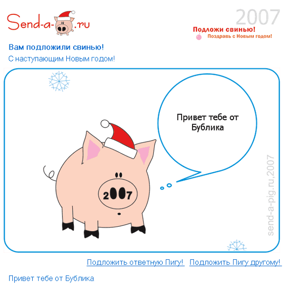 Новое модное развлечение в преддверии Нового года, который некоторые считают годом свиньи (кому, как говорится, что), - проект "Подложи свинью". Нечто вроде виртуальной открытки. Выбираешь свинью, указываешь кому, от кого и пишешь соответствующий текст. Адресат получает нечто вроде этого: