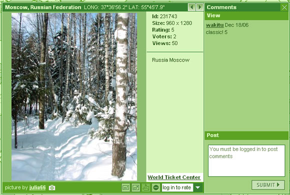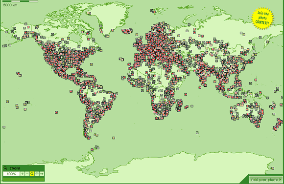 Как раз в тему фотографий еще один проект - Woophy. Мощнейший ресурс с очень наглядным представлением, на котором пользователи со всего мира размещают фотографии, сделанные в тех или иных местах земного шара. Фотографии привязываются к географической карте: