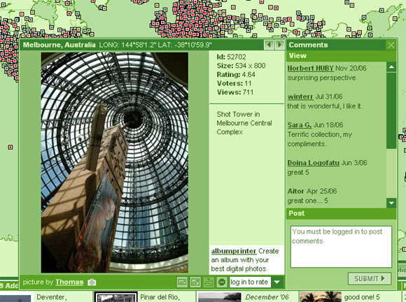 Дергаешь за веревочку - дверь и открывается, в том смысле что достаточно щелкнуть мышью по нужной точке карты - и пожалуйста тебе набор соответствующих фотографий, каждую из которых можно выбирать и увеличивать, одновременно просматривая все комментарии: