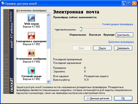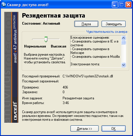 Это так называемый простой режим информации: выбор уровня защиты и некоторая статистика. Если щелкнуть по кнопке "Детали", появится экран с подробными сведениями о работе систем антивируса.