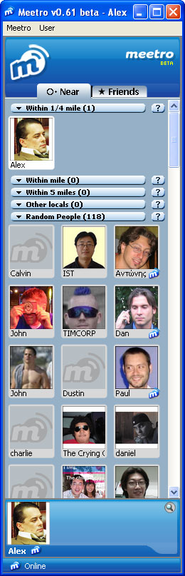 Прислали ссылку (спасибо Виталию) на довольно забавную версию мессенджера - Meetro. Это, в общем, обычный мессенджер вроде ICQ, который, в отличие от всех остальных программ подобного типа, обладает довольно интересной функциональностью - поиском людей, которые живут недалеко от вас. Делается это очень просто. При регистрации Meetro просит вас заполнить адресные данные, которые вовсе не будут демонстрироваться любым желающим, - они скрыты в системе. Далее, при входе в сам мессенджер, Meetro покажет вам всех зарегистрированных в системе пользователей, которые проживают недалеко от вас - в пределах одной мили, пяти миль, ну и в других районах, которые вы укажете сами (например, в районе вашей работы).