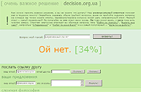 Рекомендую весьма полезный, интересный и даже необходимый сайт - "Очень важное решение". На первый взгляд, сервис, представленный там, очень простой: вы вводите вопрос и получаете на него однозначный ответ (это вовсе не генератор случайных чисел, разночтений там не бывает). Вы можете сказать - что же тут такого? Подумаешь, дает ответ на вопрос! Подбрось монетку или коробок спичек, вот тебе и будет ответ на вопрос.