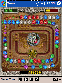 Кстати, я тут в последнее время зафанател игрушкой Zuma (старина Плющев упомянул ее в своем дневнике, а он плохого не посоветует). По уровню увлекательности и одновременной простоте - сильно напоминает "Тетрис" или Lines. Она есть и в версии для обычного PC, и для всевозможных КПК. На КПК в нее играть даже прикольнее - точно вам говорю. Вот скриншотик с моего T-Mobile...