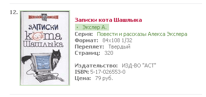 Летом заметно повышается спрос на шашлык. Вероятно, поэтому книжка "Записки кота Шашлыка" в рейтинге Top20 издательства "АСТ" вышла уже на 12-е место по продажам. Это приятно.