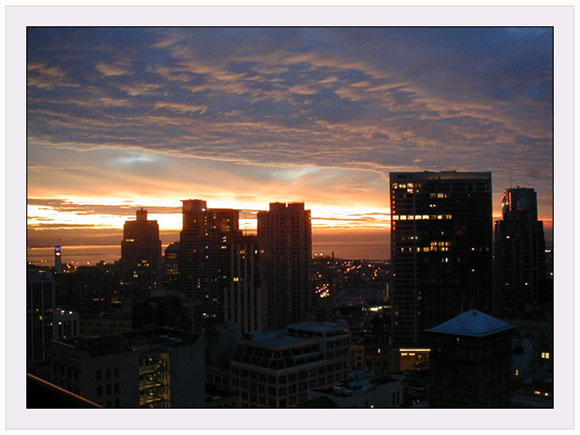 Рассвет над Сан-Франциско. Снималось через стекло окна отеля