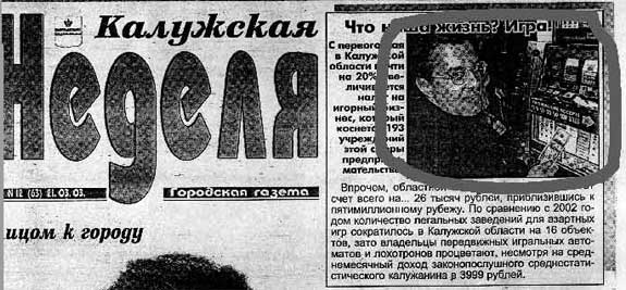 Но жизнь идет. Жизнь идет, однозначно. В Москве - жара, во Флориде - жара, на Северном полюсе - холодрыга, на Южном полюсе, как ни странно, тоже не жарко. А в Калуге активнейшим образом развивается игорный бизнес. Поэтому им наплевать, холодно на улице или жарко. У них градус всегда повышенный, потому что ИГРА! Кстати, в газете "Калужская неделя" даже опубликована фотография одного из самых активных калужских игроков. Хотите полюбоваться на эту рожу? Вот она: