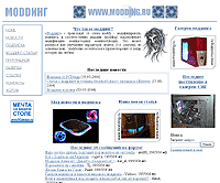 Впрочем, прежде чем восхищаться, давайте поговорим о том, что можно найти на сайте Modding.ru. А там, как не сложно догадаться, представлены различные статьи с советами и алгоритмами моддинга различных компьютерных устройств, а также галереи с примерами работ. О чем рассказывают в статьях? О подсветке дна корпуса, об установке окон в корпус компьютера, об "остеклении" и "осветлении" обычного модема, об установке в корпус различных дополнительных датчиков и индикаторов, о нестандартной расцветке всего компьютерного комплекта, о превращении корпуса компьютера в аквариум с сохранением его полной функциональности - и так далее. Так что если у вас дома найдутся отвертка, паяльник и дрель, а ваши руки - не для скуки, тогда читайте эти статьи и пытайтесь воплотить нечто подобное. Купить корпус необычной расцветки - дело нехитрое. А вот из обычного корпуса сотворить гипервизионный квазиконвертер - вот этим уже можно с полным на то основанием хвастаться перед знакомыми.