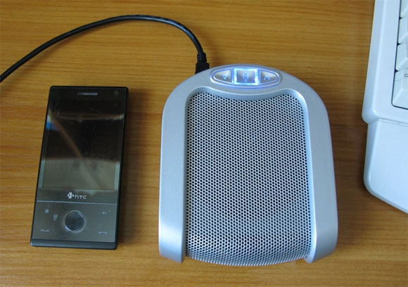 Конечно, существуют специальные устройства для проведения конференций, но они достаточно дороги - для домашнего использования такие приобретать нет никакого смысла. Но, оказывается, выпускаются и более дешевые аналоги, вполне подходящие для подобных задач. Одно такое устройство выпускает Logitech, но в нем нет аппаратного подавления эха. Другое выпускают китайцы, и мне удалось его потестировать (друзья привезли показать). Называется оно DUET USB Speakerphone. Производит его компания Phoenix. Вот как эта штука выглядит:
