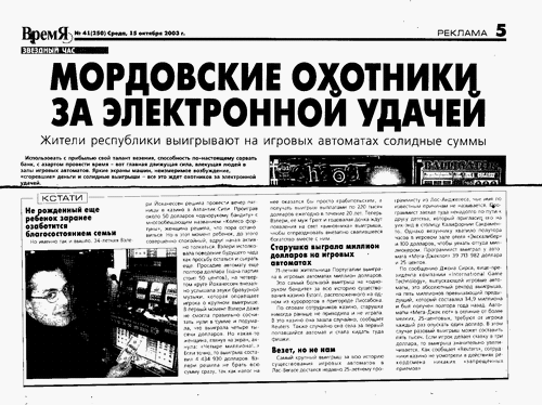 Продолжается победоносное хождение моей лас-вегасской фотографии по различным печатным изданиям. Я об этом уже писал здесь и здесь. А вот новое поступление в коллекцию (большое спасибо Тине, которая любезно отсканировала страничку из газеты и прислала ее мне). Теперь я - игровая звезда Мордовии: