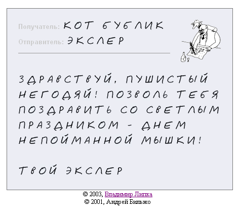 Второй вариант - открытка, созданная для вашего визави самим Андреем Бильжо! Честное слово! Вводите имя и адрес получателя, а также поздравительный текст,  после чего получаете примерно следующее:
