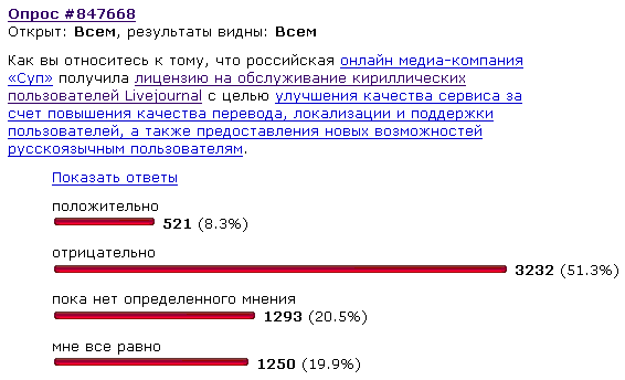Затем "Суп" без промедления приобрел у Six Apart, как было заявлено, "лицензию на поддержку русскоязычных пользователей LiveJournal". Вероятно, в лицензию также входит право что-то там рекламировать среди этих пользователей (иначе на черта коммерческой структуре непонятный альтруизм), но об этом не говорили. Говорили, причем с большой помпой (в Москву даже зачем-то привезли Фицпатрика, который должен был то ли, в гроб сходя, благословить супец, то ли выступить чем-то вроде тотема), что теперь у русскоязычных пользователей LiveJournal начнутся сплошные молочные реки с кисельными берегами - мол, все в дупель русифицируют, уберут ограничение в 750 человеко-френдов, предложат новые сервисы и так далее, поэтому все русскоязычные пользователи должны цак надеть и очень-очень радоваться.