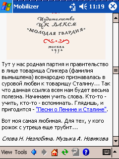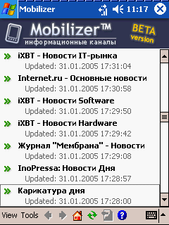 Лично я этим сервисом крайне доволен и приношу огромные благодарности его создателям - это действительно очень удобно. Я не успеваю в Интернете читать любимые новостные и прочие сайты, а теперь, так как их последние выпуски у меня всегда с собой, в дороге или в очередях могу насладиться по полной программе. Выглядит это примерно так (снимок с экрана КПК):