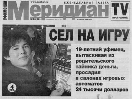 Похождения известного лас-вегасского гемблера (то есть меня) продолжаются. Напоминаю, я уже писал вот в этом, этом и этом обзорах о том, каким образом в газетах эксплуатируют мою фотографию из Лас-Вегаса. Продолжение, как оказалось, было не за горами. Булат из Уфы любезно прислал отсканированную страничку из газеты "Уфимский меридиан", в которой, правда, позаимствовали уже не всю фотку, а только ее часть, прилепив мне голову юного уфимца. Выглядит это вот так: