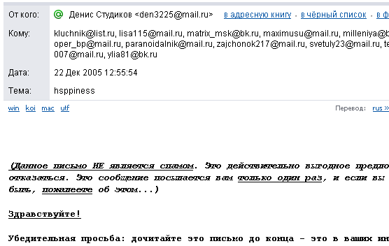 Правда, на Mail сделали странный финт ушами, благодаря которому спамеры за несколько дней с легкостью получат почтовые адреса всех блоггеров, но так как администрация портала ни разу не откликнулась ни на приватные письма по этому поводу, ни на звон в колокола - вероятно, они считают, что так и надо. Им не хотелось напрягаться, а заспамленные пользователи - это проблема самих пользователей, считают на Mail.