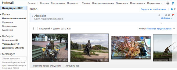 Изображения, приложенные к письму, теперь просматриваются очень и очень удобно. Предпросмотр дается в виде скроллируемой линейки с уменьшенными изображениями.