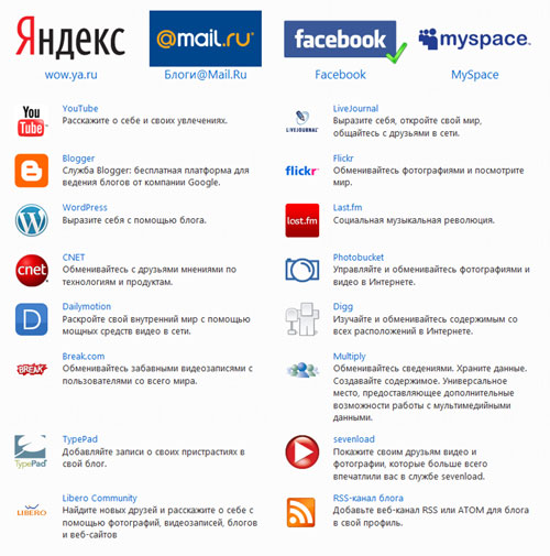 Надо сказать, что в Windows Live интеграция со всякими социальными сетями сделана на очень высоком уровне. Поддерживается целая куча самых разнообразных служб.