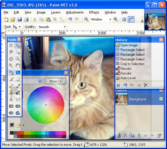 Впечатления от работы с Paint.NET - вполне хорошие. "Фотошоп" он, конечно, не заменит даже рядом, однако как бесплатный Photoshop Lite - вполне сойдет. Большинство инструментов в нем - такие же, как в "Фотошопе": слои, история изменений с полноценным пошаговым или групповым откатом, многооконность (кстати, переключение между файлами сделано значительно удобнее, чем в седьмом "Фотошопе", - см. скриншот), ну и плюс - по-фотошоповски реализованы некоторые вполне удобные вещи, например создание нового файла из буфера обмена.
