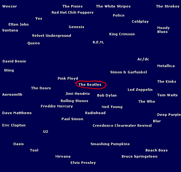 Забавный сервис, который, правда, работает только с англоязычными именами и названиями, - Music Map. Вводите имя исполнителя или ансамбля, после чего получаете карту связанных с ними исполнителей и ансамблей. Работает довольно интересно, особенно для тех, кто разбирается. Вот карта для The Beatles: