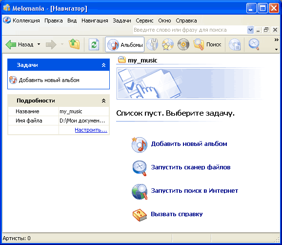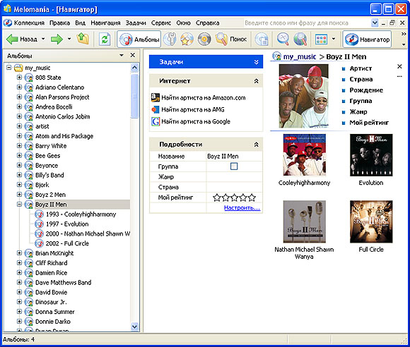 Навигация по альбомам выполнена очень удобно. Вы можете просматривать список исполнителей и альбомов, а также работать с деревом каталога: