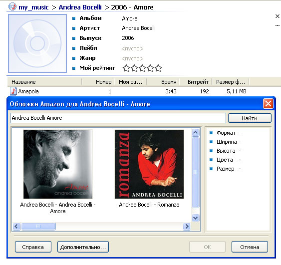 Обложки дисков действительно с легкостью скачиваются из Интернета - быстро и эффективно. Плюс - поддерживается вставка обложки или изображения из буфера обмена или с жесткого диска. Слева в панели размещены три полезные ссылочки: найти исполнителя (альбом) на Amazon, AMG и в Google, помогающие в поиске обложек и фотографий исполнителей.