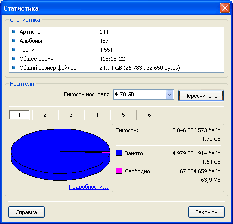 Также весьма интересна статистика, подсчитывающая потребное количество носителей для записи всей коллекции или какой-то ее части:
