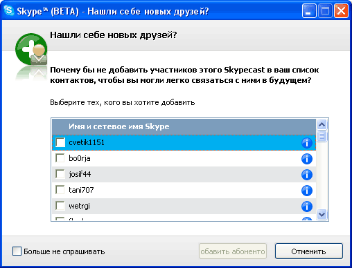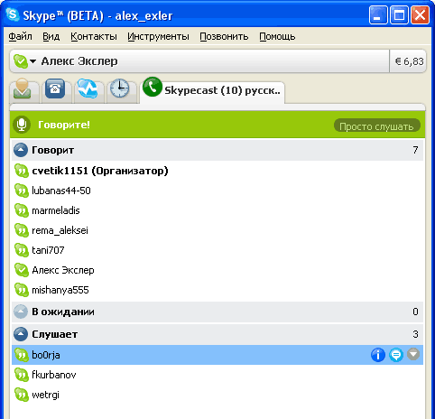 Вы можете участвовать в беседе, а можете просто слушать, нажав соответствующую кнопку. Организатор скайпкаста в любой момент может лишить всех (или конкретных) участников слова, переведя их в режим "просто слушать". По выходе из чата вам могут предложить добавить определенных его участников в свой контакт-лист.