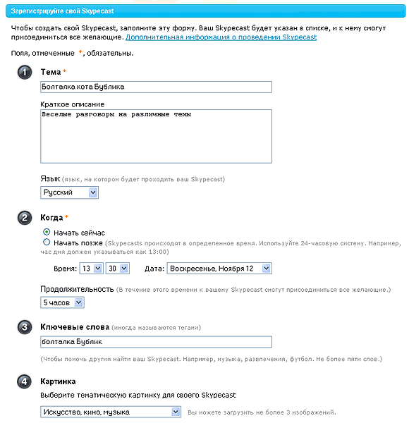Также вы можете создать свой скайпкаст, задав различные параметры: тему, описание, время и дату начала, ключевые слова, картинку и так далее.