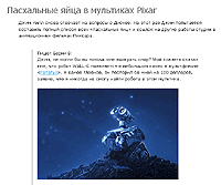 Любопытное чтение - "пасхальные яйца" в мультфильмах Pixar. "Пасхальные яйца" - это всякие забавные мульки-фишки, закладываемые разработчиками в программы, фильмы и еще куда-нибудь. В программах "пасхальные яйца" вызываются по какому-нибудь экзотическому сочетанию клавиш (насколько я помню, в одной из старых версий Excel можно было вызывать поиграть какой-то простенький уровень знаменитой стрелялки), а в мультфильмах они носят характер камео персонажей или каких-то предметов из других мультфильмов. Как выяснилось из статьи, они там попадаются весьма часто.