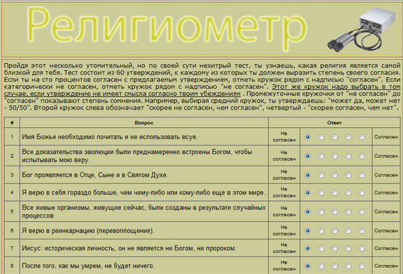 Сейчас по Сети гуляет множество реклам самых разных "тестов" вроде проверки IQ, которые, по сути, представляют собой обычное жульничество: вам предлагают долго и нудно отвечать на вопросы, а перед самым получением результата выясняется, что за него нужно заплатить отправкой SMS. Предлагаемый мною нижеследующий тест "Религиометр" жульничеством совершенно точно не является - я проверил: вы просто отвечаете одним из пяти вариантов на шестьдесят вопросов, после чего получаете ответ, приверженцем какой религии вы, скорее всего, являетесь. Ну а точнее, на сколько процентов ваши воззрения соответствуют тем или иным религиям.