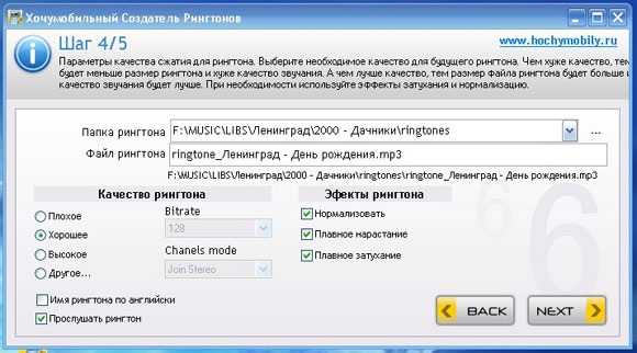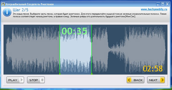 Решить эту проблему можно с помощью программы, позволяющей вырезать из аудиотрека нужный кусок. Таких программ существует немало - как платных, так и бесплатных. Одна из таких бесплатных программ называется несколько своеобразно "Хочумобильный Создатель Рингтонов". Работает это все следующим образом. Сначала скачиваете и устанавливаете программу.