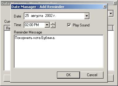 Вот и все. На самом деле очень удобно. Держать все время запущенный Microsoft Outlook только из-за подобных напоминаний - глупость. А такой Date Manager места не занимает, практически незаметен, а все необходимые функции напоминания вполне выполняет. Кроме того, программа совершенно бесплатна.