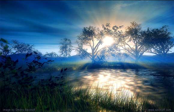 Сначала, не мешкая, отправляйтесь в "Галерею". Вот где самый супер! Дмитрий на компьютере такие картины рисует, что хоть стой, хоть падай. Вот, например, как вам картина под названием "Morning Lake" (это уменьшенное изображение; при нажатии на картинку, откроется полноразмерный варианта с сайта Savinoff.com)?