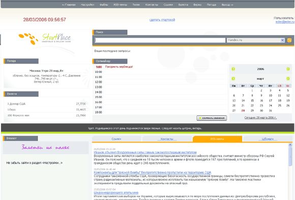 Создатели Startplace к данному вопросу подошли несколько по-иному. Они посчитали, что крутому интернетовскому пользователю кроме всяких информеров, заголовков и ссылок нужны еще органайзер с календарем, база контактов и постоянно обновляемая информация о ценных бумагах. В соответствии с этим нехитрым постулатом и строится их стартовая страница. Вы регистрируетесь (там есть возможность зайти под демонстрационной регистрацией и потестировать сервис), создаете свою страничку и лезете в настройки. Впрочем, в настройках вариантов выбора - весьма немного. Вы можете отметить нужные вам виды валют, стартовый поисковик, RSS-ленту по умолчанию (только одну), ценные бумаги по умолчанию и временной диапазон органайзера. Вот и все.