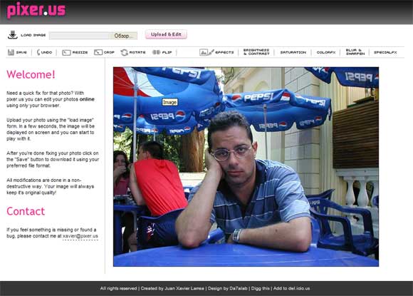 Один из таких весьма полезных сервисов - Pixer.us, представляющий собой ни много ни мало - онлайновый графический редактор, в котором с фотографией или картинкой можно сотворить следующие действия: уменьшить, обрезать, перевернуть, подстроить яркость, контраст и прочие параметры, а также применить всякие разные визуальные эффекты.