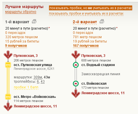 Пользоваться ресурсом очень удобно. Вводите пункт отправления и пункт назначения, после чего получаете несколько вариантов маршрута с использованием различных выбранных видов городского транспорта.
