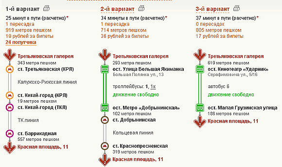 В качестве исходных точек также можете выбирать различные объекты: станции метро, музеи и так далее. Например, актуальный для приезжих вопрос: как проехать от Третьяковской галереи до Красной площади. (Москвичи, как известно, в Третьяковке не бывают - им это не к лицу.)