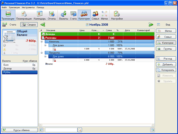 Alex, "Личные финансы", которые ты рассмотрел - устаревшая версия, она уже лет 5 как не обновляется. Теперь ее создатель занимается следующей версий, под названием AbilityCash (на сайте dervish.ru она фигурирует как "Cash 2", скачивается тут: http://www.dervish.ru/cashalpha.php .