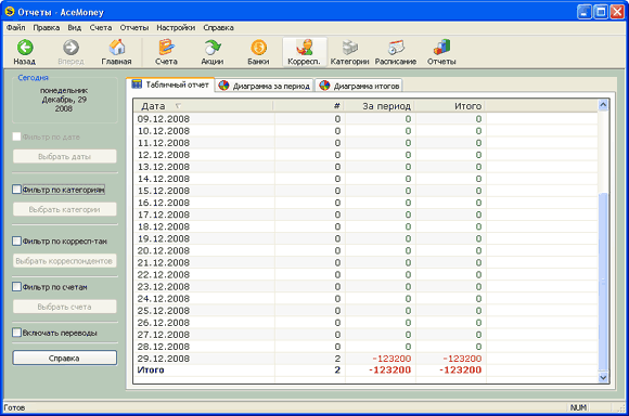 Тем не менее все остальное идет в плюсы. Простой и наглядный интерфейс, хороший сервис при вводе даннных (всякие калькуляторы, сортировка), хороший фильтр отбора информации при просмотре транзакций плюс итоговая таблица общих сумм, учет должников и кредиторов, планирование расходов и доходов, очень удобная и наглядная форма составления отчетов. Короче говоря, именно то, что мне нужно. Я не буду утверждать, что это лучшая программа для учета домашних финансов, тем более что я видел далеко не все, но из того, что видел, именно она мне подошла больше всего.