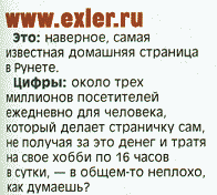 Очень интересно читать о себе статью, адресованную молодежи в возрасте от трех до пяти лет. Вероятно, поэтому там приводятся такие интересные цифры - около трех миллионов (!) посетителей в день и 16 часов в день, которые я трачу на Экслер.Ру (на самом деле у меня общий рабочий день где-то 14-16 часов, но на Экслер.Ру при этом тратится от 2 до 4 часов, не больше).