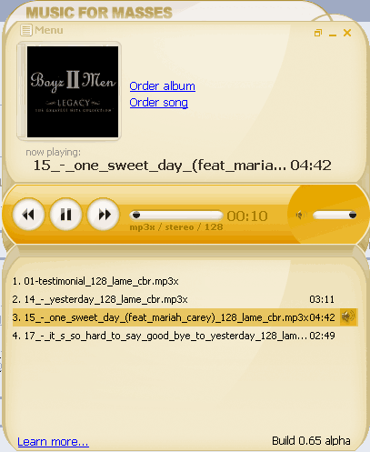 После этого просто открываете подготовленные треки в плеере Music For Masses - они будут воспроизводиться во вполне приличном качестве (учитывая бесплатность) - 128 kbps.