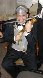 Кроме того, меня посвящали в рыцари (см. прилагаемую фотографию) и не очень удачно треснули мечом по плечу, как этого требует древний ритуал. Точнее, по плечу-то треснули удачно, но промахнулись и попали по башке. И она у меня от этого гудела весь день, причем на мотив старого гимна Александрова, который я люблю и уважаю (ведь на самом деле - очень прикольная музычка), так что было не до обзоров.