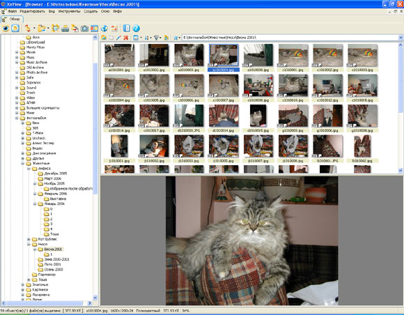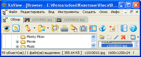 Окно браузера XNView выглядит очень похожим на ACDSee: слева идет дерево папок, справа в большом окне - уменьшенные изображения, снизу - увеличенное изображение, выделенное в данный момент курсором.